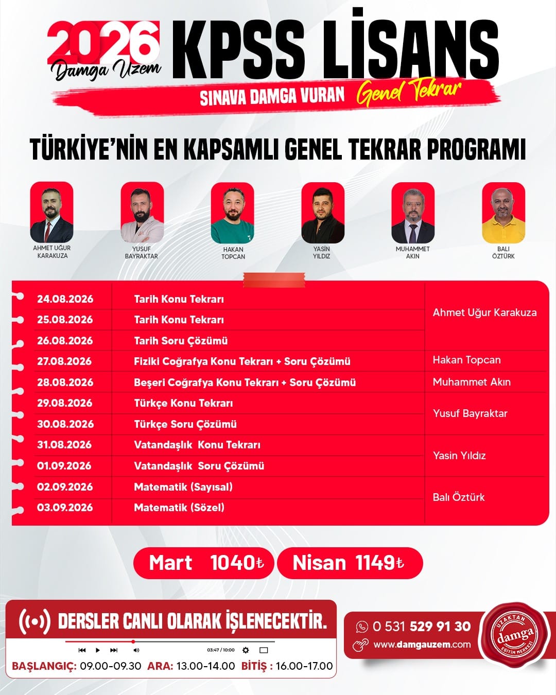 Damga UZEM ile tüm konuları baştan sona toparlayacağın, soru tarzlarını pekiştireceğin ve sınava tam donanımlı hazırlanacağın final kampı başlıyor! ⚡